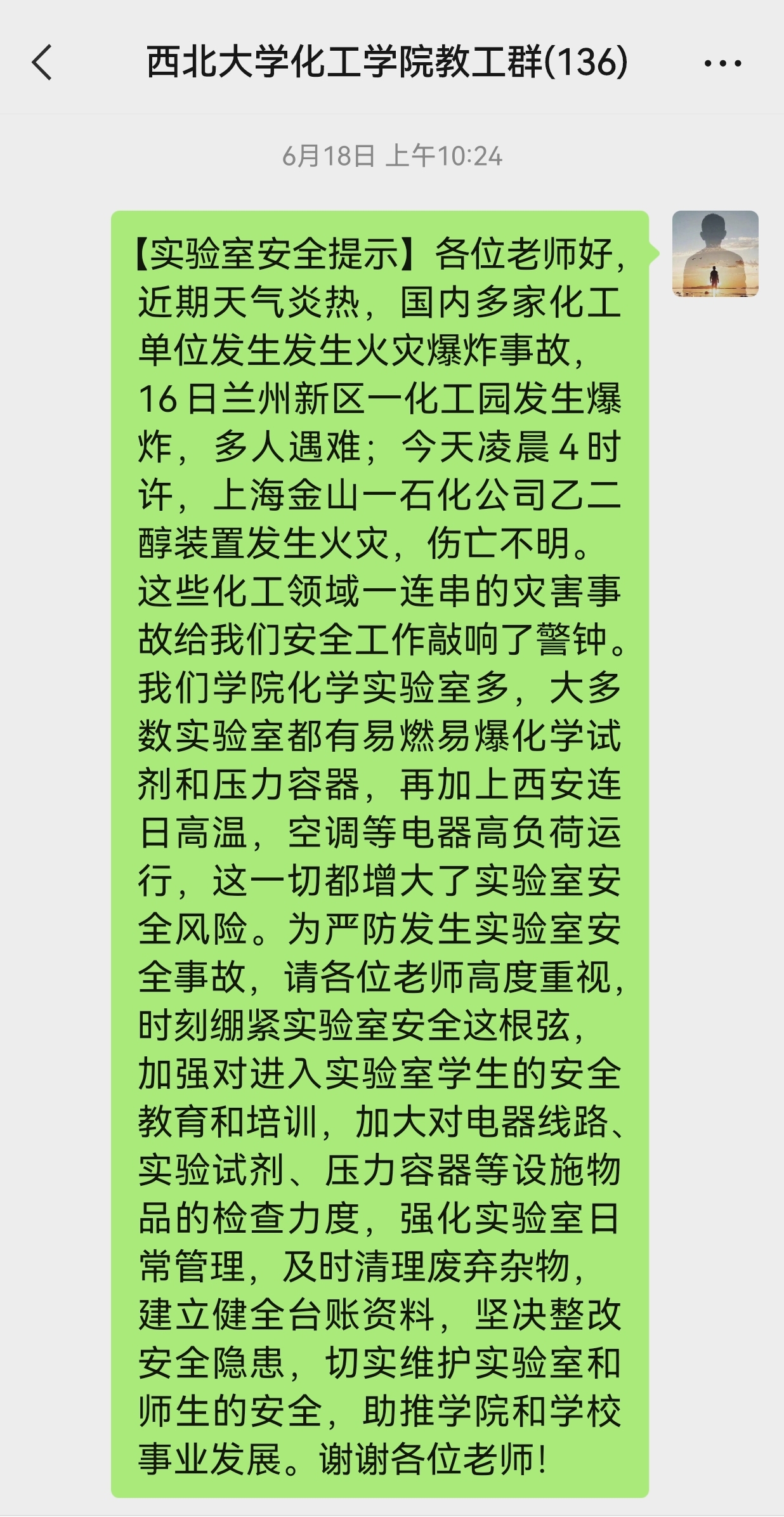 为做好安全宣传工作,学院在化工楼和工程中心大楼等处悬挂了实验室安全宣传横幅,制作摆放了安全宣传展板。从实验室规章制度、仪器设备操作规程、危险化学品管理规范、安全事故预防和处置、安全防护和自救等方面为师生普及了实验室安全的重要性和做好该项工作的方式方法。同时,微信工作群作为实验室安全宣传的重要阵地,学院会定期发布安全提示,通报国内外发生的各种安全事故,反复强调实验室安全的重要性,并要求全院教师加强实验室安全管理,时刻绷紧安全生产这根弦。