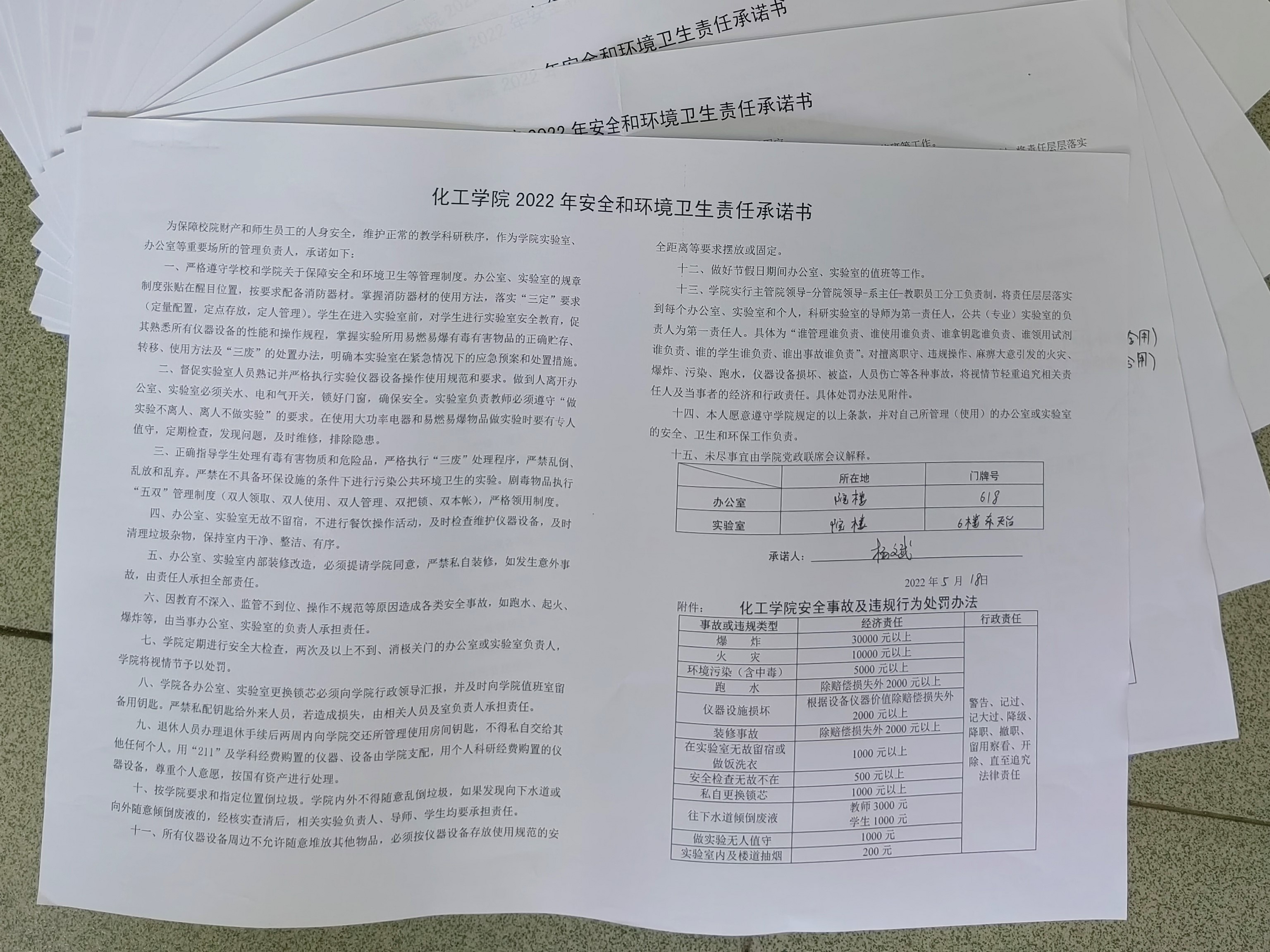 为夯实实验室安全责任,学院要求所有教师签订《安全和环境卫生责任承诺书》,并要求存在问题的实验室签订《实验室安全隐患自查整改承诺书》,坚决贯彻“谁管理、谁负责,谁使用、谁负责”的原则,督促教师切实负起实验室安全监管责任,确保各项安全措施落实到位。