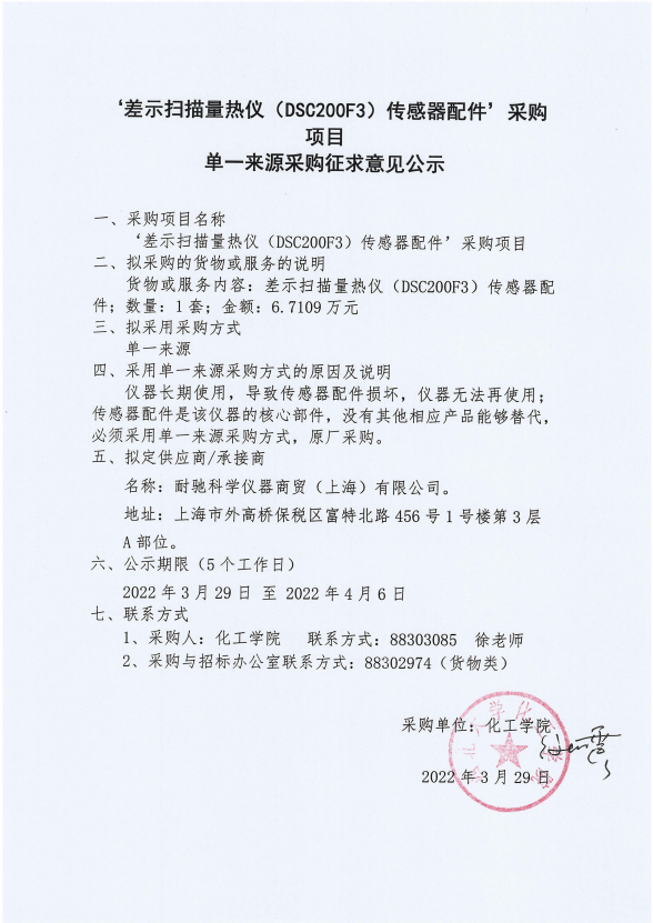 “差示扫描量热仪传感器配件”单一来源采购征求意见公示