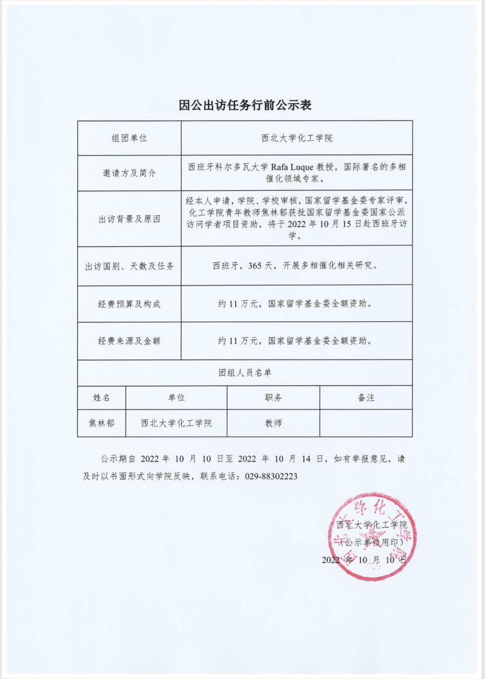 关于焦林郁因公出访任务行前公示