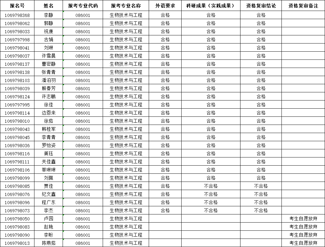 表1 生物技术与工程专业“申请-考核”制复试考生名单