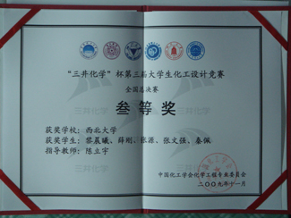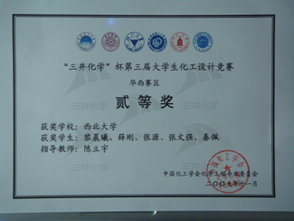 11月21日, 2009年“三井化学杯”第三届大学生化工设计竞赛在华东理工大学落下帷幕,我校世俱杯sjb官网“新睿”团队荣获本次大赛华西赛区贰等奖、全国总决赛叁等奖。