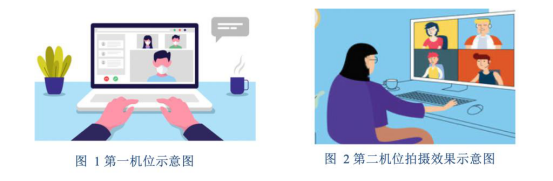 3.可以支撑“双机位”运行的硬件设备。两部带摄像头的设备以及可进行通话的麦克风等设备,建议一部电脑、一部手机。第一机位为主机位(建议为笔记本电脑),面向考生,用于远程网络复试考核。原则上,放置主机位的桌子应紧贴墙面;第二机位为副机位(监考机位),放于考生侧后方,用于观测考核环境。务必提前为设备充电。