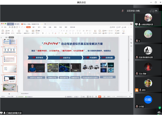 百度是拥有强大互联网基础的全球四大AI公司之一,拥有提供AI芯片、软件架构和应用程序等全栈AI技术。百度公司智能交通教育行业解决方案及Apollo架构师白杨,通过报告的形式详细地介绍了百度在AI方向的生态系统,重点介绍了百度自动驾驶领域软件平台Apollo在教育行业方面的生态合作解决方案-自动驾驶虚拟仿真实验室。希望与学校在科研、实验平台资源共享和学生实践教学等方面加强合作。