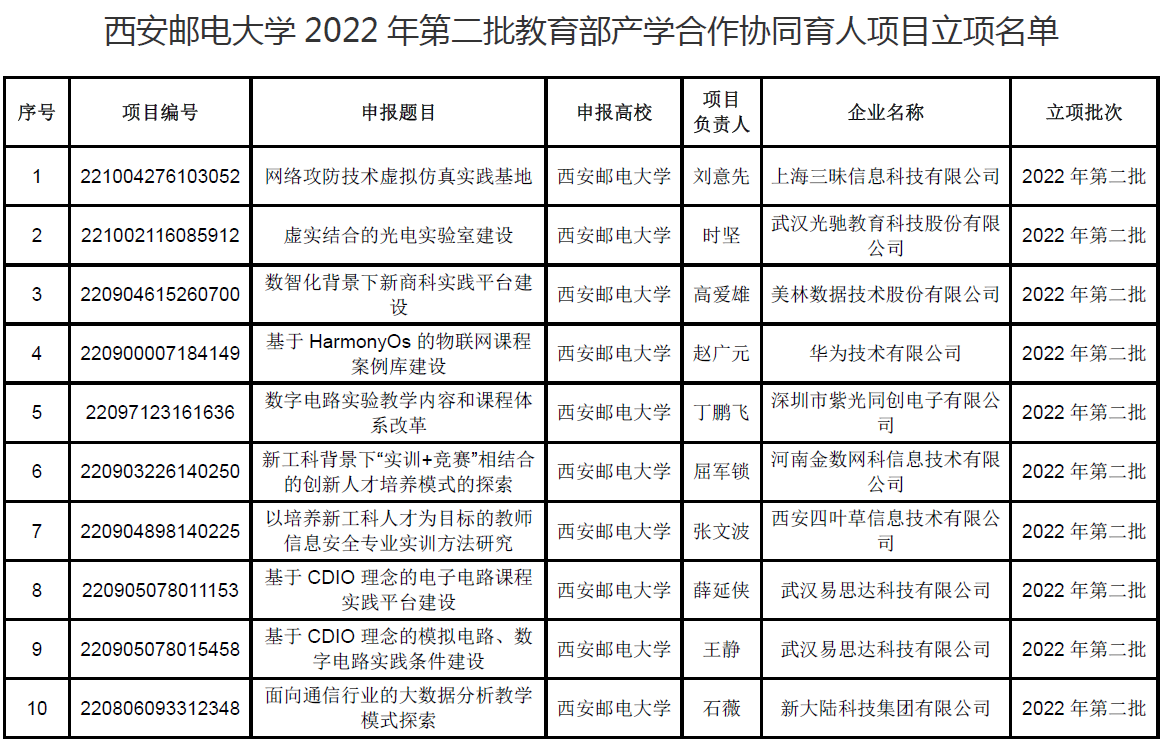近日,教育部高等教育司公布了2022年第二批产学合作协同育人项目立项名单,我校获批10项教育部2022年第二批产学合作协同育人项目,其中由我院石薇老师负责的“面向通信行业的大数据分析教学模式探索”获批立项。