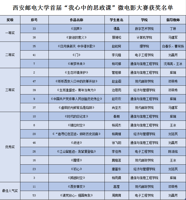 近日,由马克思主义学院联合党委宣传部、教务处、学生工作部、研究生工作部共同主办的西安邮电大学首届“我心中的思政课”大学生微电影展示活动大赛评选结果揭晓。经专家组评审,最终评选出一等奖2项,二等奖3项,三等奖5项,优秀奖8项,最佳人气奖2项,其中我院学生作品《希梦未来》获得二等奖,《生态环境保护》、《中国共产党依靠人民创造历史伟业》2部作品获得三等奖,《时代的日记本》、《错位时空》、《歧途》、《跨越时空》4部作品获得优秀奖。