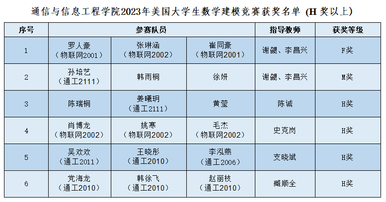 近日,2023年第39届美国大学生数学建模竞赛(MCM/ICM)成绩揭晓,我校学生共获得特等奖提名(F奖)1项、一等奖(M奖)2项、二等奖(H奖)6项、三等奖(S奖)22项,其中我院物联网2001班罗人豪、物联网2002班张琳涵、物联网2001班崔同豪团队获得特等奖提名(F奖)1项,其他团队获得一等奖(M奖)1项、二等奖(H奖)4项、三等奖多项。