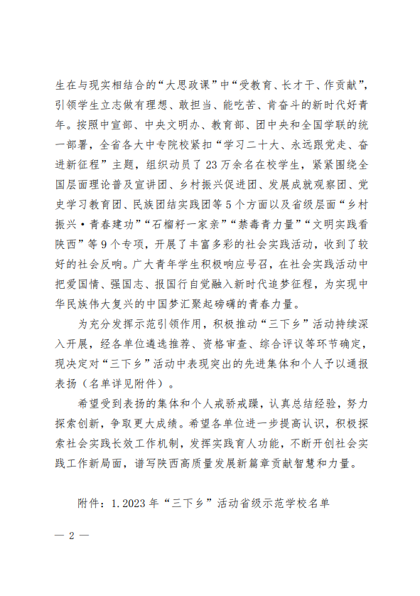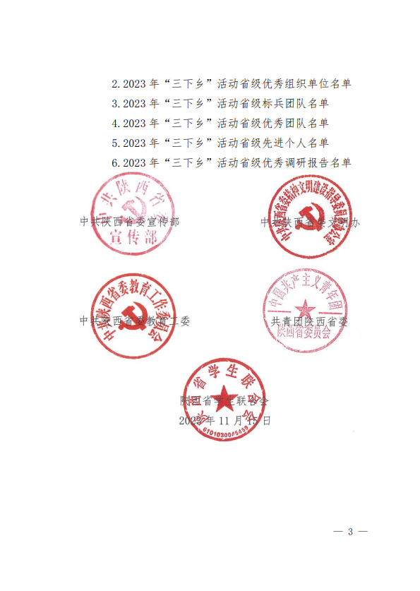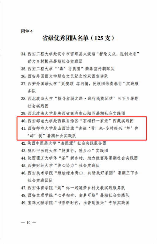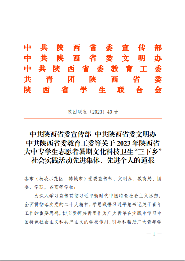 近日,中共陕西省委宣传部、中共陕西省委教育工委、共青团陕西省委、中共陕西省委文明办、陕西省学生联合会联合下发《关于2023年陕西省大中专学生志愿者暑期文化科技卫生“三下乡”社会实践活动先进集体、先进个人的通报》,我校被授予“2023年陕西省大学生暑期‘三下乡’社会实践活动省级示范学校”称号,bwin必赢指导的“古往‘晋’来--乡村振兴‘邮’你‘邮’我”——西安邮电大学赴山西运城暑期社会实践团队获“省级优秀团队”称号。