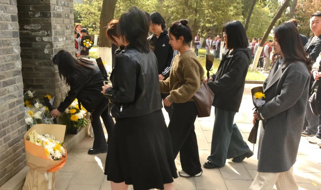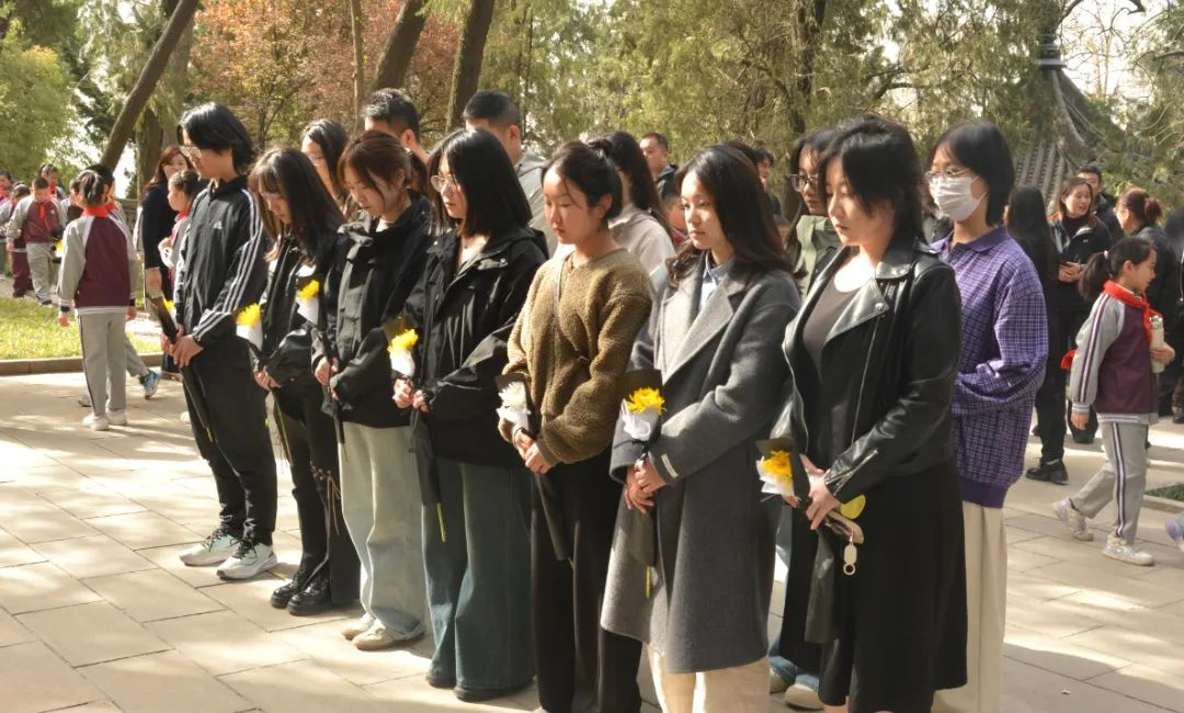 全体师生在烈士墓前整齐列队,学生代表缓步上前,向杨虎城将军墓敬献花圈,整理缎带。全体人员肃立默哀一分钟,深切追思先烈为民族独立与解放事业作出的伟大牺牲。随后,同学们详细讨论了杨虎城将军的生平事迹,回顾其从贫苦出身到投身革命、力主抗日,直至发动西安事变推动全民族抗战的壮烈历程。在场同学们依次敬献鲜花并绕墓一周,以行动表达对烈士的无限哀思与崇高敬意。